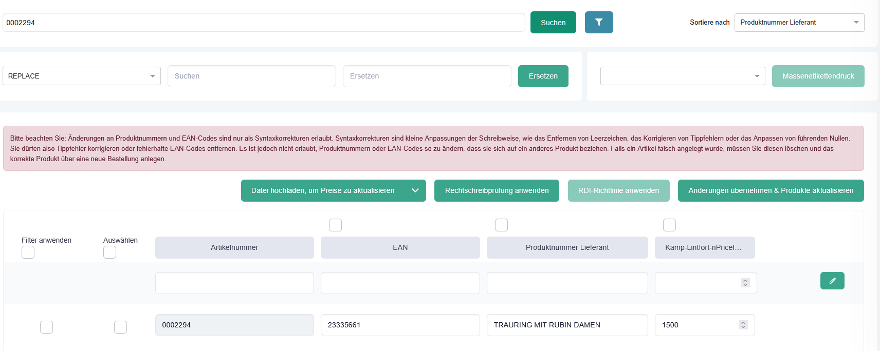 Wählen Sie den passenden Filtertyp (Artikelnummer, Lieferantennummer oder EAN).