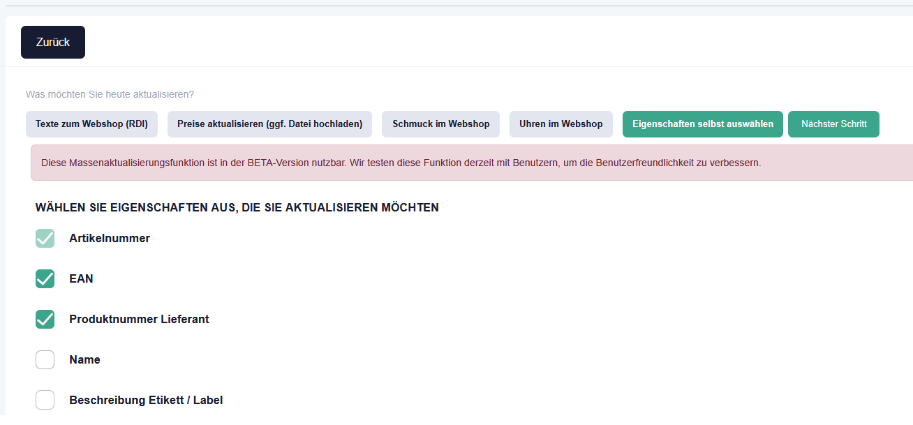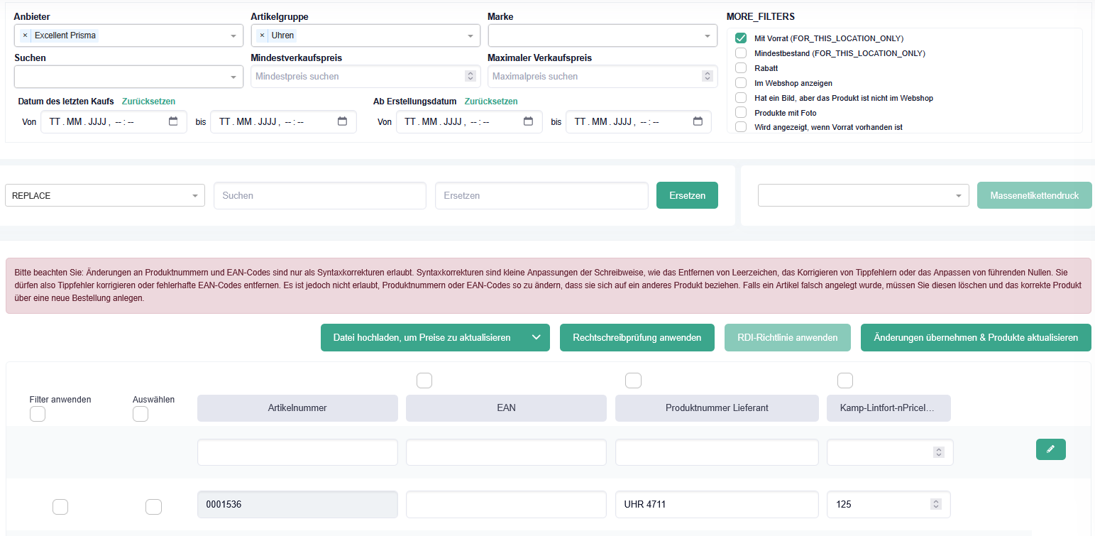 Standardmäßig sind bereits Artikelnummer, EAN und Produktnummer Lieferant markiert.