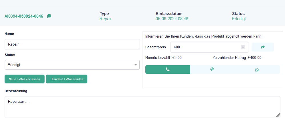 Dann ist es möglich, den Kunden darüber zu informieren, dass die Reparatur abgeholt werden kann.