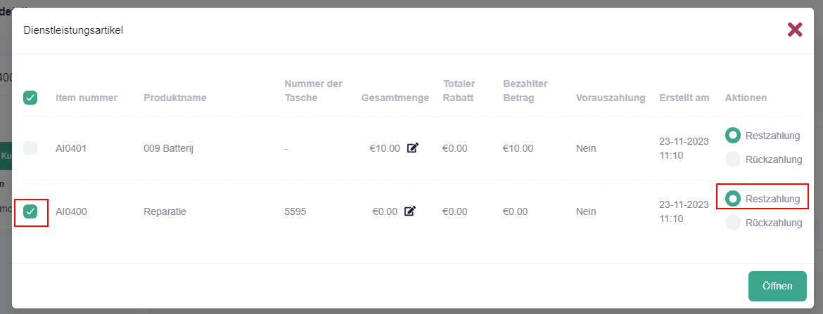Gibt es mehrere Produkte, die mit dieser Transaktion verbunden sind? Wählen Sie dann nur das Häkchen für die Reparatur aus.
