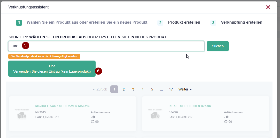 6. Klicken Sie auf das angezeigte Produkt (und fahren Sie mit Schritt 8) oder klicken Sie auf die grüne Schaltfläche, um ein neues Produkt zu erstellen (und fahren Sie mit Schritt 7 fort).