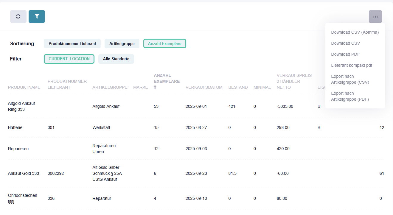 Verkaufsliste herunterladen - Übersicht über Verkäufe