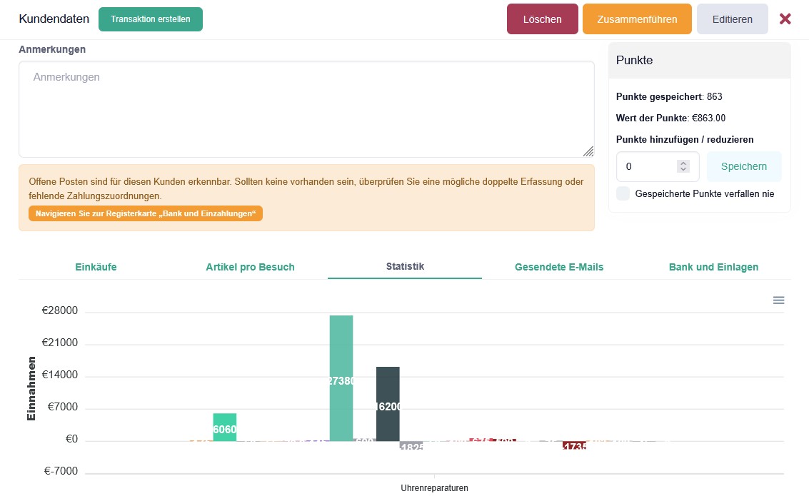 Kunden - Auswertungen über die Einkäufe, Artikel pro Besuch, Umsatz, Zahlungen