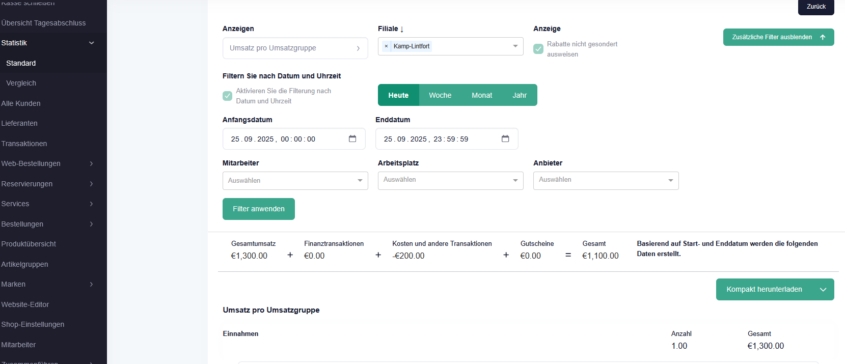 Umsatz anzeigen und exportieren 1. Klicken Sie im Menü auf "Statistik" 2. Wählen Sie den Zeitraum mit "Anfangsdatum" und "Enddatum". 3. Klicken Sie auf die Schaltfläche "Filter anwenden" 4. Klicken Sie auf die grüne Schaltfläche "Kompakt ...