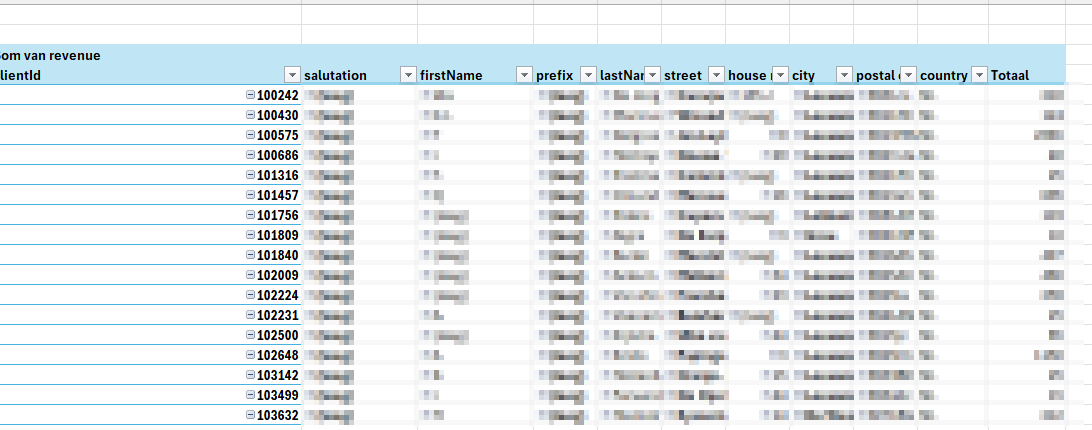 7. Klik aan de rechterkant op 'clientId' , 'salutation', 'firstname', 'prefix', 'lastname', 'revenue', 'street', 'house number', 'city', 'postal code' en 'country'