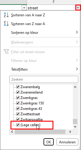 Eventueel kan u klikken op het driehoek icoon achter 'street' en dan het veld (Lege cellen) uitschakelen.