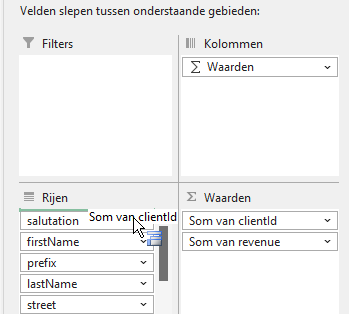 8. Zorg dat rechts onderin alle velden onder 'Rijen' staat, behalve 'revenue'. Sleep deze in het venster 'Waarden' als deze er nog niet staat.