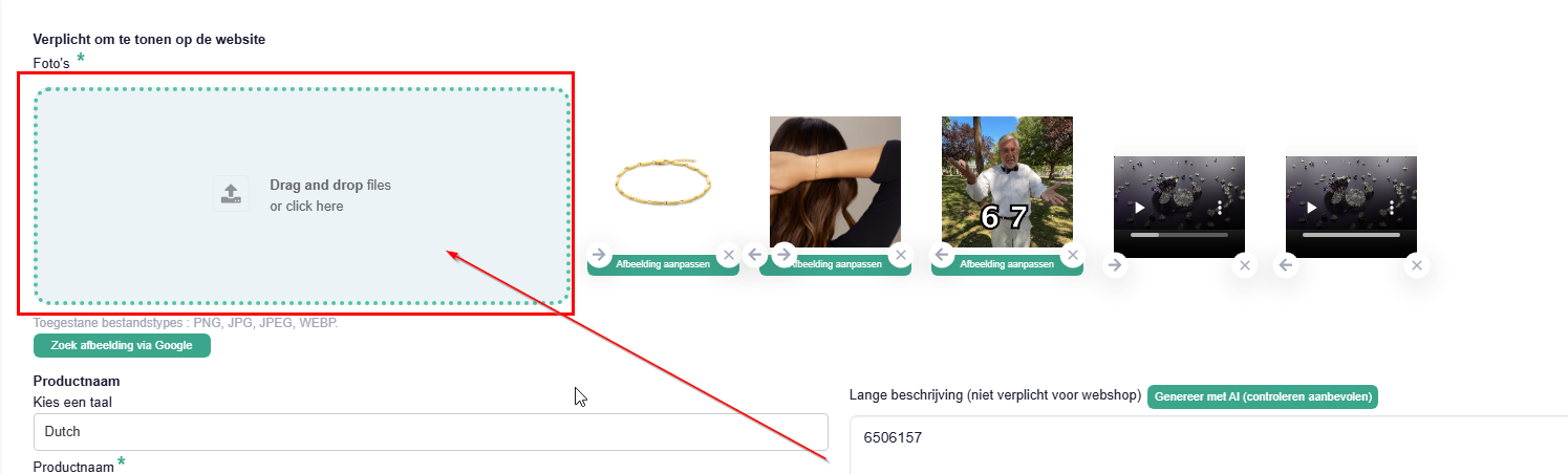 Upload je video's via de productpagina via hetzelfde venster waarmee je ook foto's upload. (max 10 mb per video)